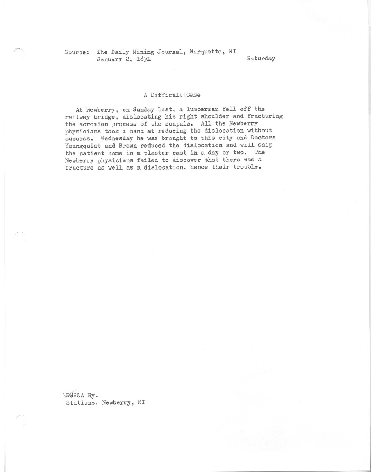 At Newberry, on Sunday last, a lumberman fell off the railway bridge, dislocating his right shoulder and fracturing the acromion process of the scapula. All the Newberry physicans took a hand at reducing the dislocation without success.