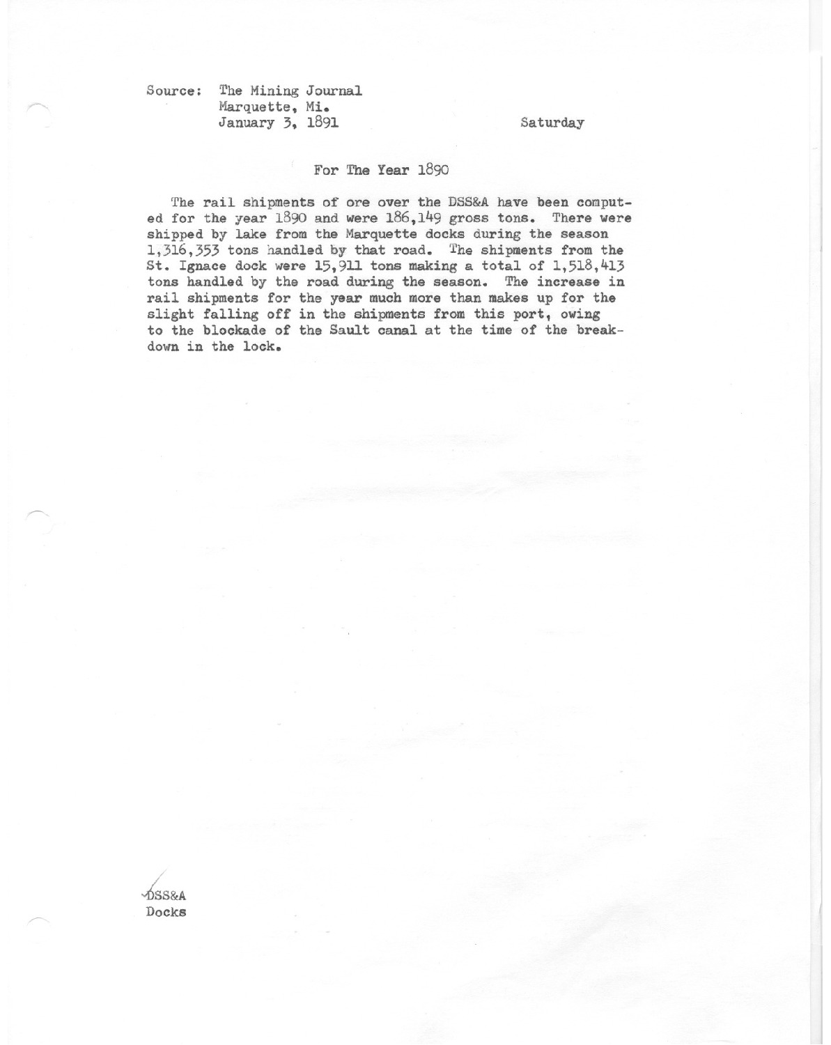 The rail shipments of ore over the DSS&A have been computed for the year 1890 and were 186,149 gross tons. There were shipped by lake from the Marquette docks durning the season 1,316,353 tons handled by that road.