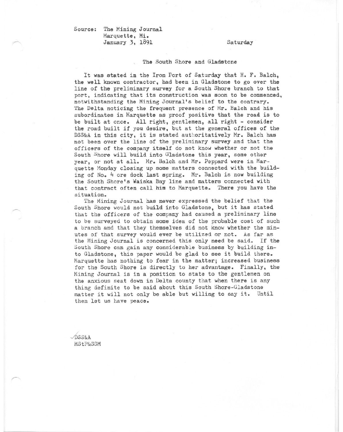 It was stated in the Iron Port on Saturday that H. F. Balch the well known contractor had been in Gladstone to go over the line of the preliminary survey of a south shore branch.