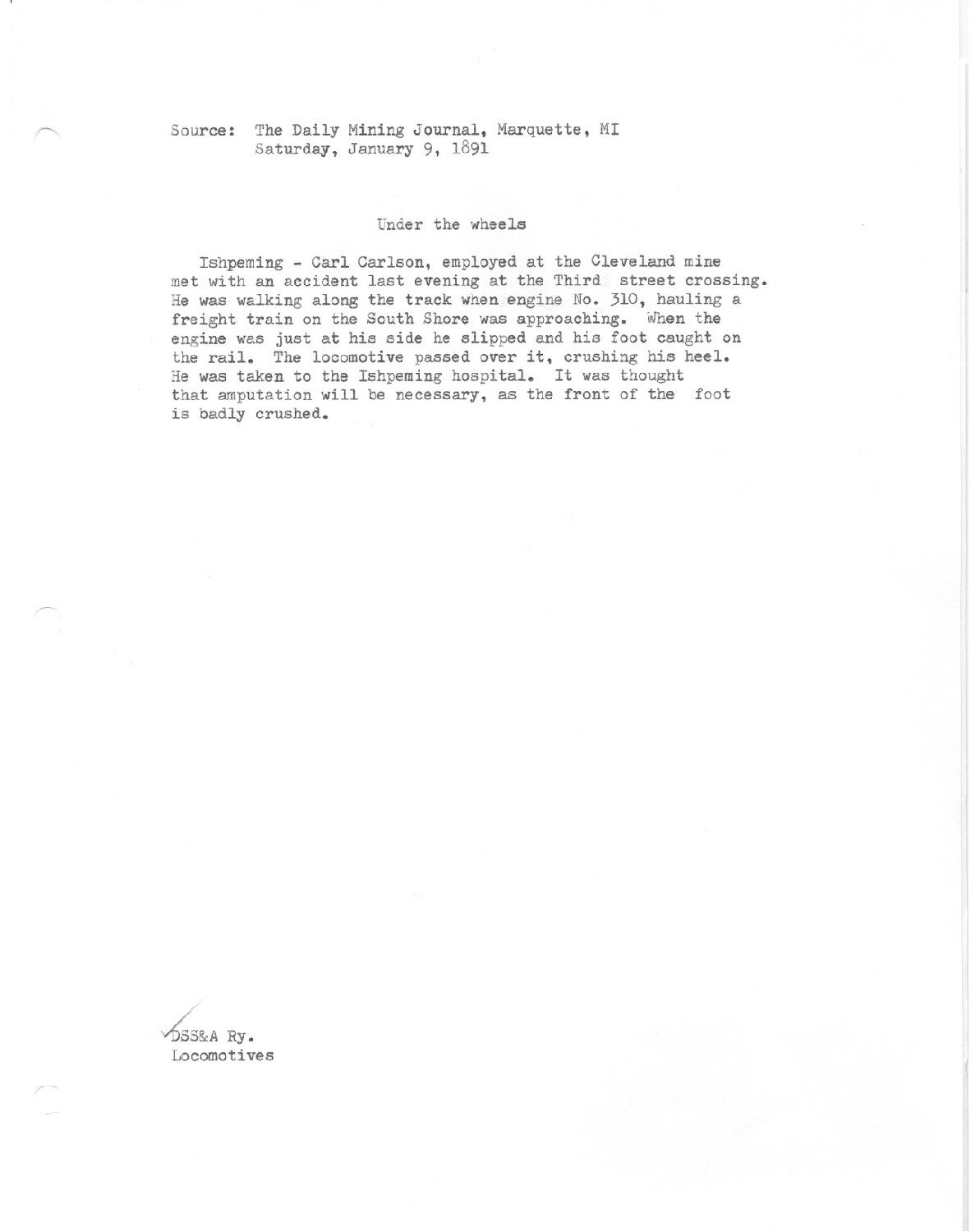 Carl Carlson, employed at the Cleveland mine met with an accident last evening at the third street crossing. He was walking along the track when engine No 310 hauling a freight train on the South Shore was approaching.