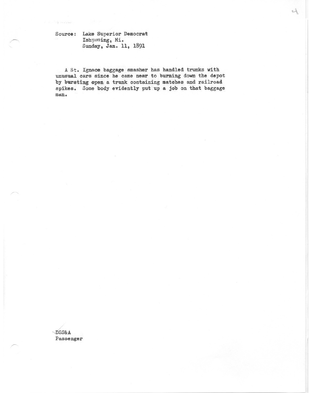 St. Ignance baggage smasher has handled trunks with unusal cars since he came near to burning down the depot by bursting open a trunk containing matches and railroad spikes. Some body evidently put up a job on that baggage man.