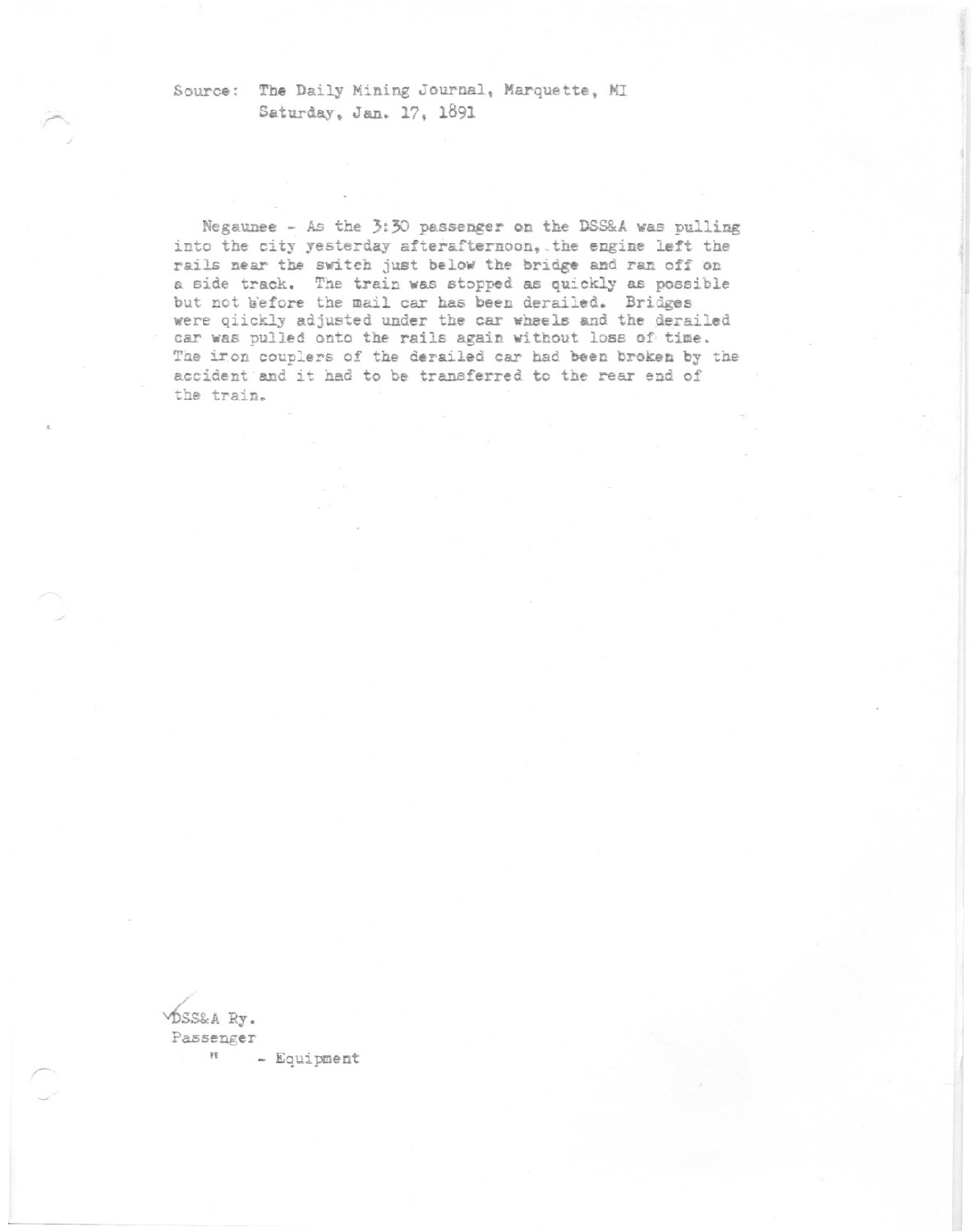 As the 3:30 passenger on the DSS&A was pulling into the city yesterday afternoon, the engine left the rails near the switch just below the bridge and ran off on a side track.
