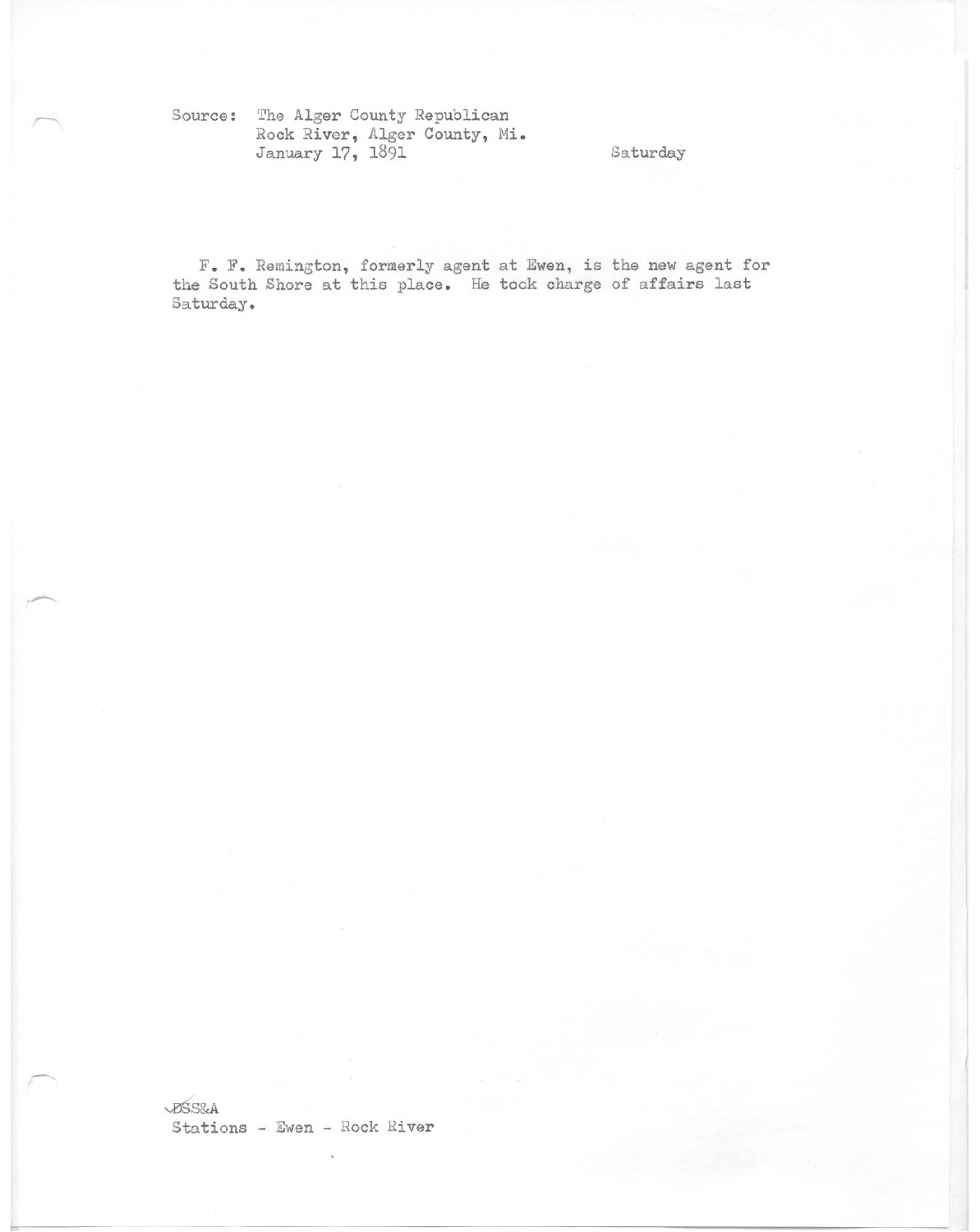 F. F. Remington, formerly agent at Ewen, is the new agent for the South Shore at this place. He took charge of affairs last Saturday.