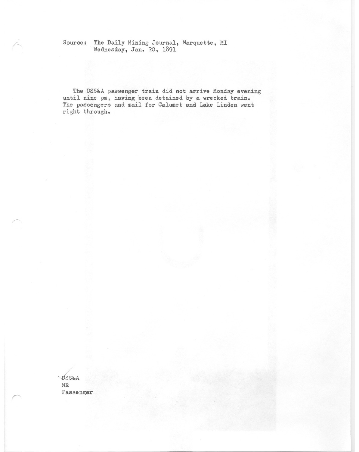 The DSS&A passenger train did not arrive Monday evening until nine pm, having been detained by a wrecked train. The passengers and mail for Calumet and Lake Linden went right through.
