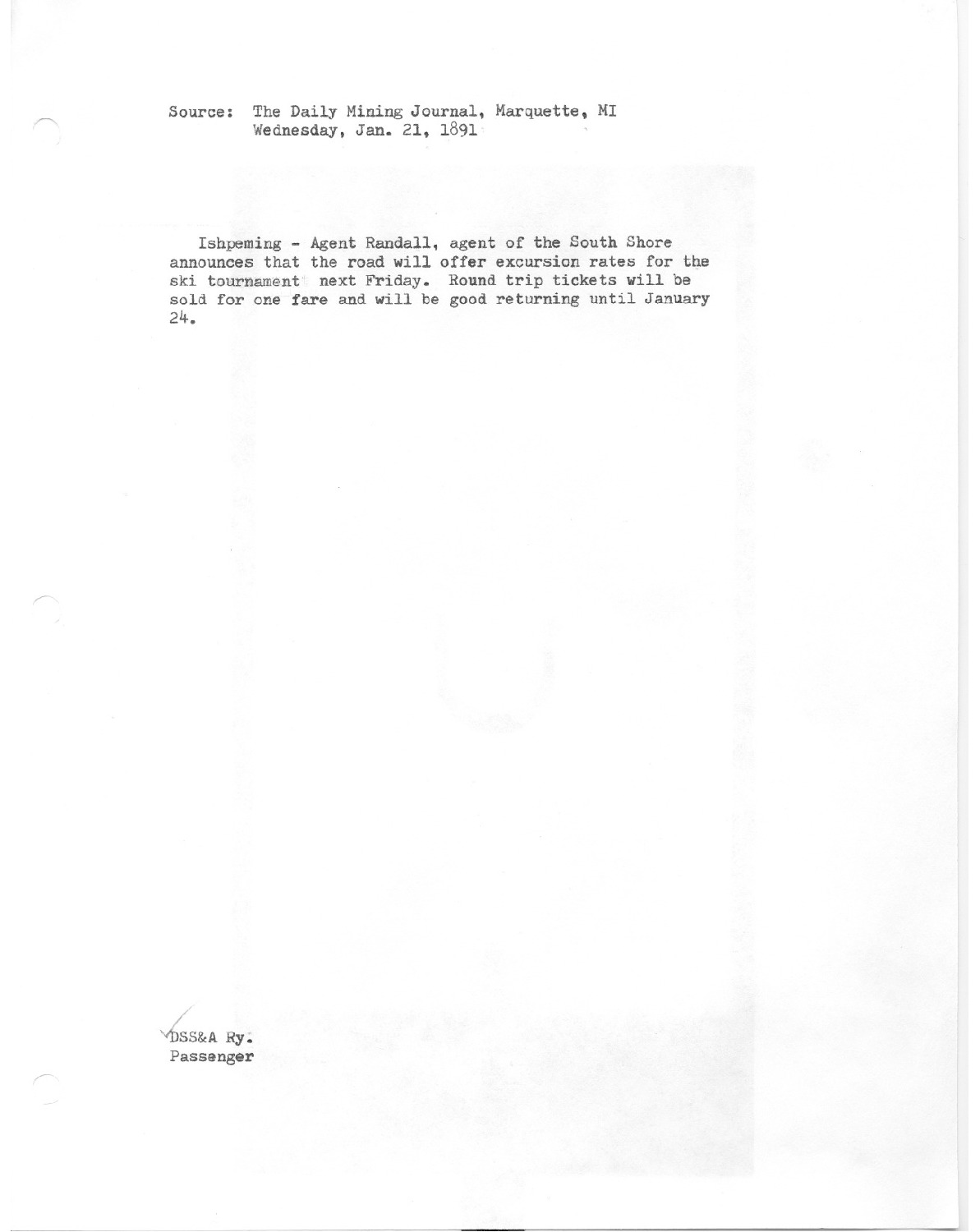Agent Randall, agent of the South Shore announces that the road will offer excursion rates for the ski tournament next Friday. Round trip tickets will be sold for one fare and will be good returning until January 24.