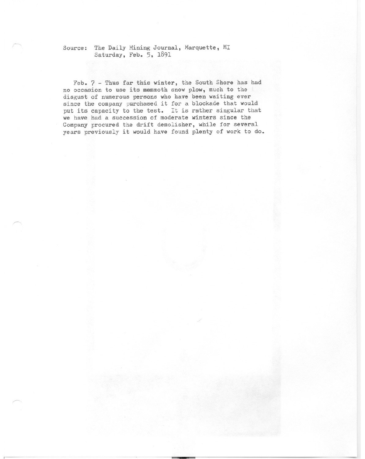 Thus far this winter, the South Shore has had no occasion to use its mammoth snow plow, much to the disqust of numerous persons who have been waiting ever since the company purchased it for a blackade that would put its capcity to the test.