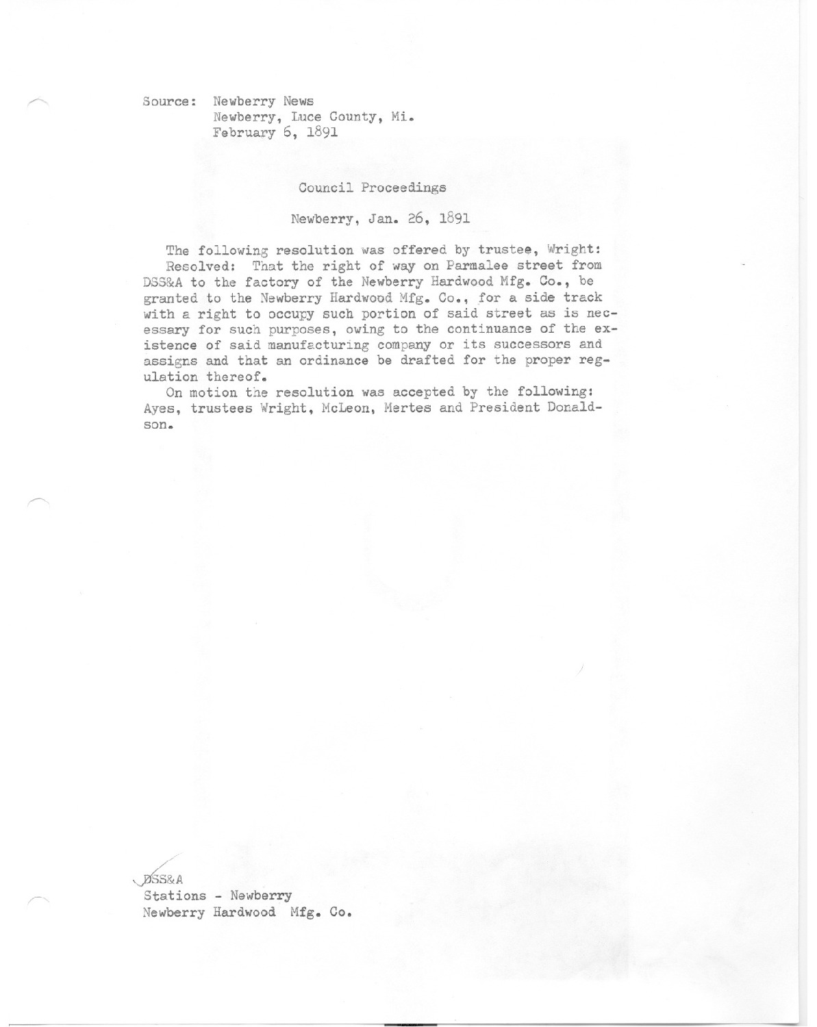 Following reslution was offered by trustee, Wright: Resolved that the right of way on Parmalee street from DSS&A to the factory of the Newberry Hardwood Mfg.Company.