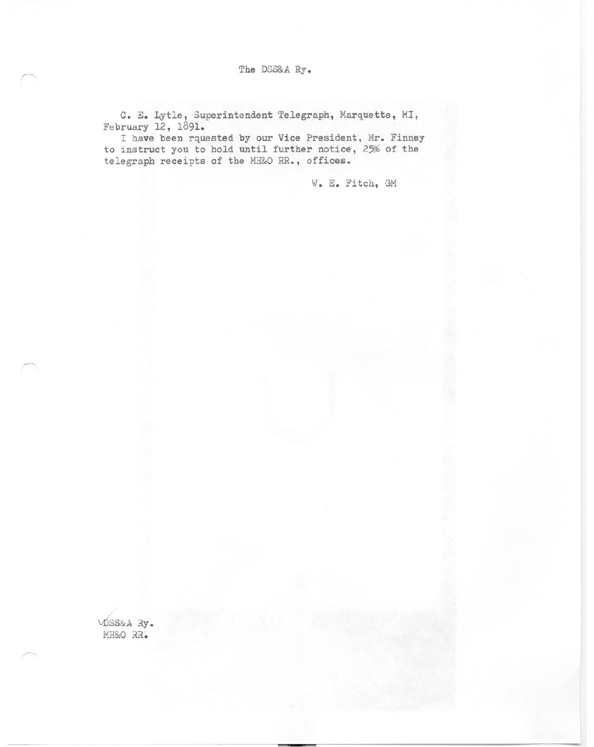 C. E. Lytle, superintendent: I have been requested by our vice president, Mr. Finney to instruct you to hold until furthern notice, 25% of the telegraph recipets of the MH&O Railroad offices. E. W. Fitch.