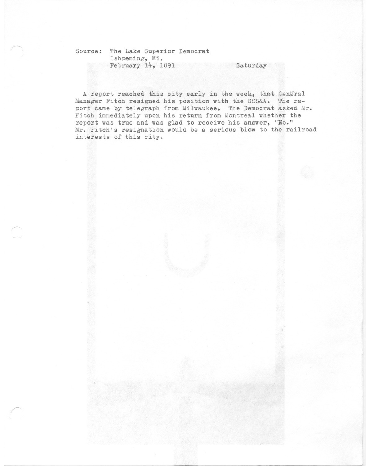 Report reached this city early in the week, that General Manager Fitch resigned his position with the DSS&A. The report came by telegraph from Milwaukee. The Democrat asked Mr. Fitch immediately upon his return from Montreal whether the report was true and was glad to recieive the answer, No.