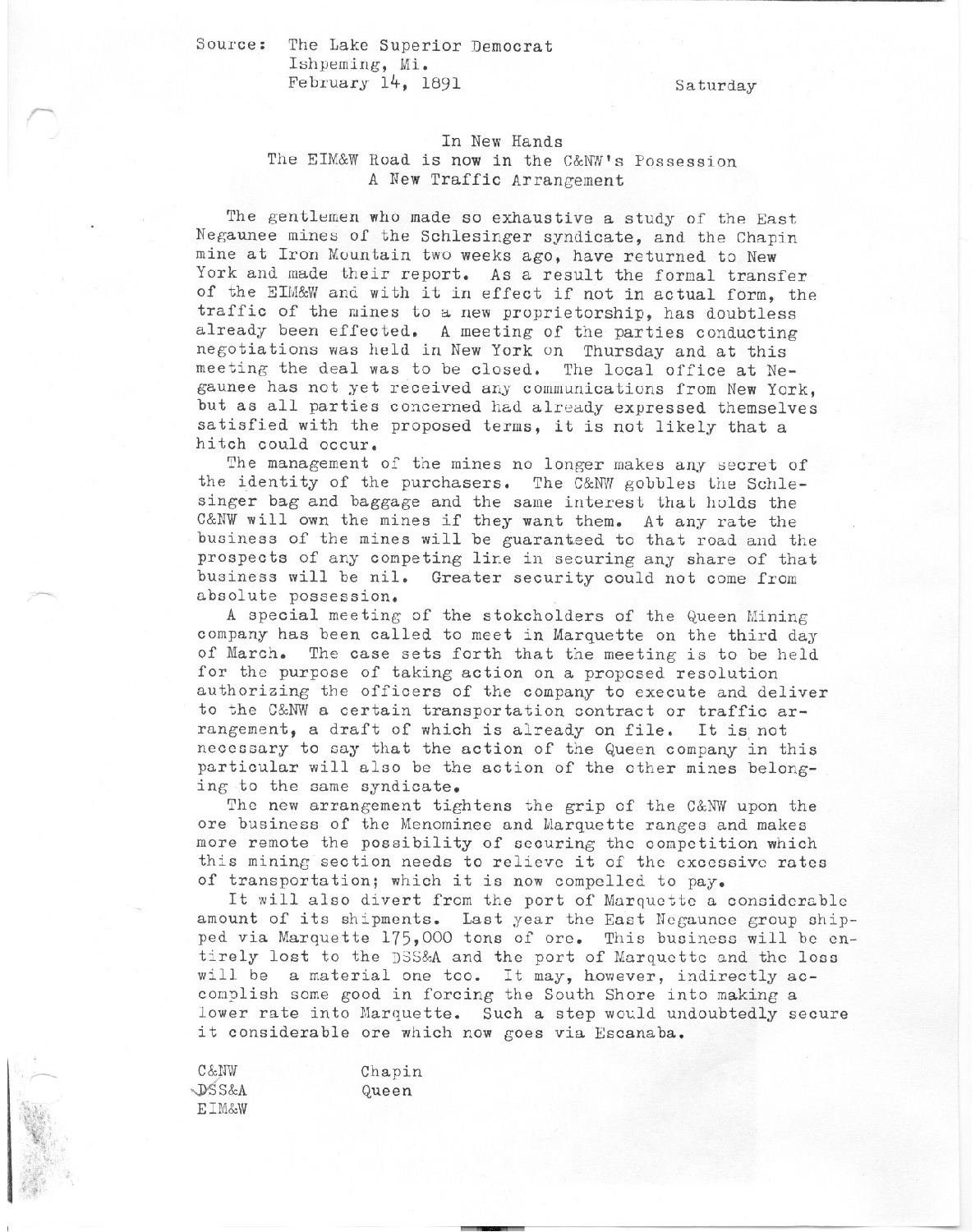 The gentlemen who made so exhaustive a study of the East Negaunee Mines of the Schlesinger syndicate, and the Chapin mine at Iron Mountain two week ago, have returned to New York and made their report.