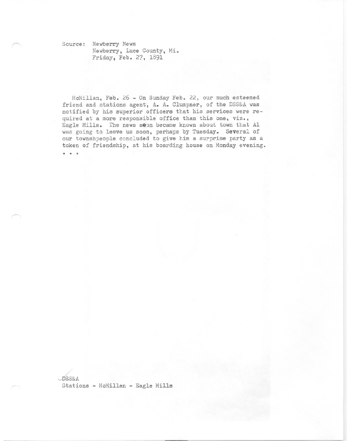 On Sunday February 22, our much esteemed friend and stations agent A. A. Clumpner of the DSS&A was notified by his superior officers that his services were required at a more responsible office that this one.