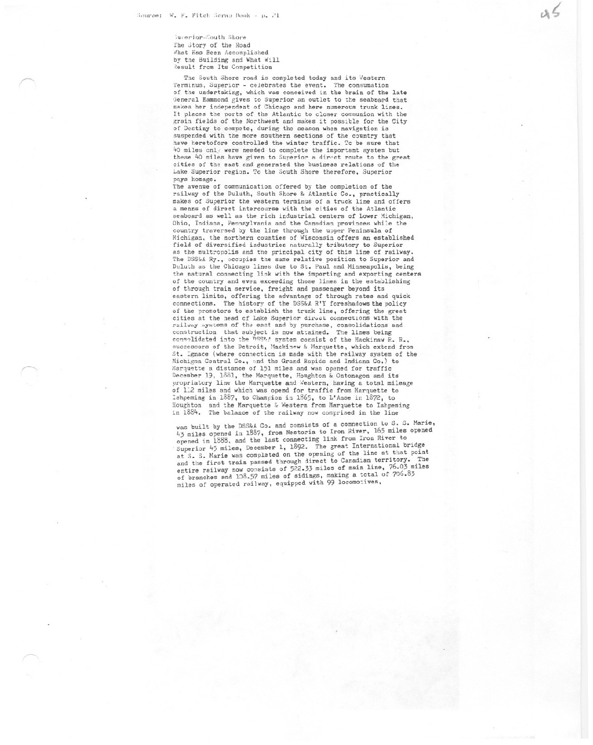 Superior-South Shore is completed today and its Western Terminus Superior celebrates the event. The consumation of the undertaking, which was conceived in the brain of the late General Hammond gives to Superior and outlet to the seaboard that makes her indepedent of Chicago and her numerous trunk lines.