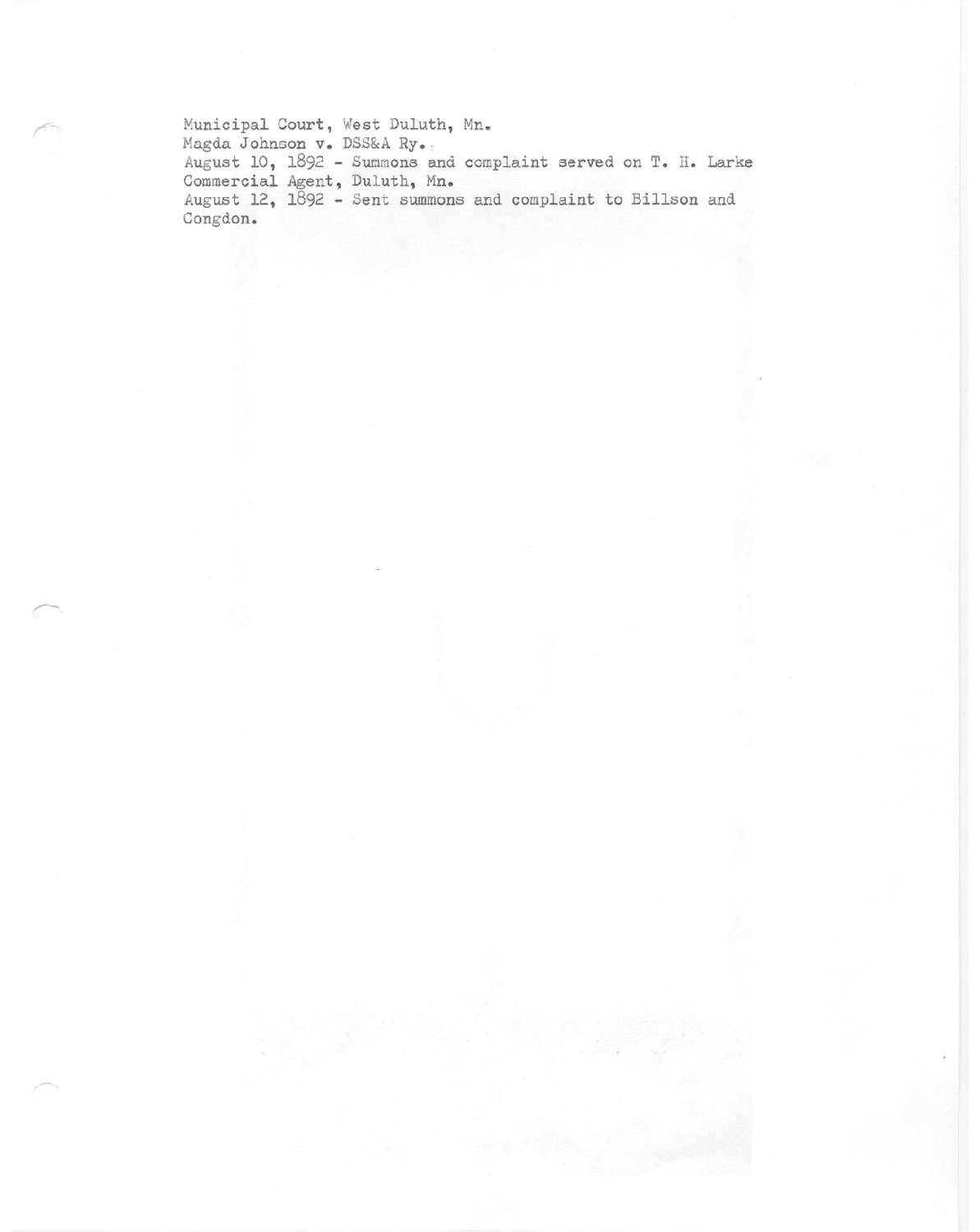Magada Johnson vs DSS&A Railroad. August 10, 1892 Summon and complaint served on T. H. Larke Commerical agent, Duluth MN.