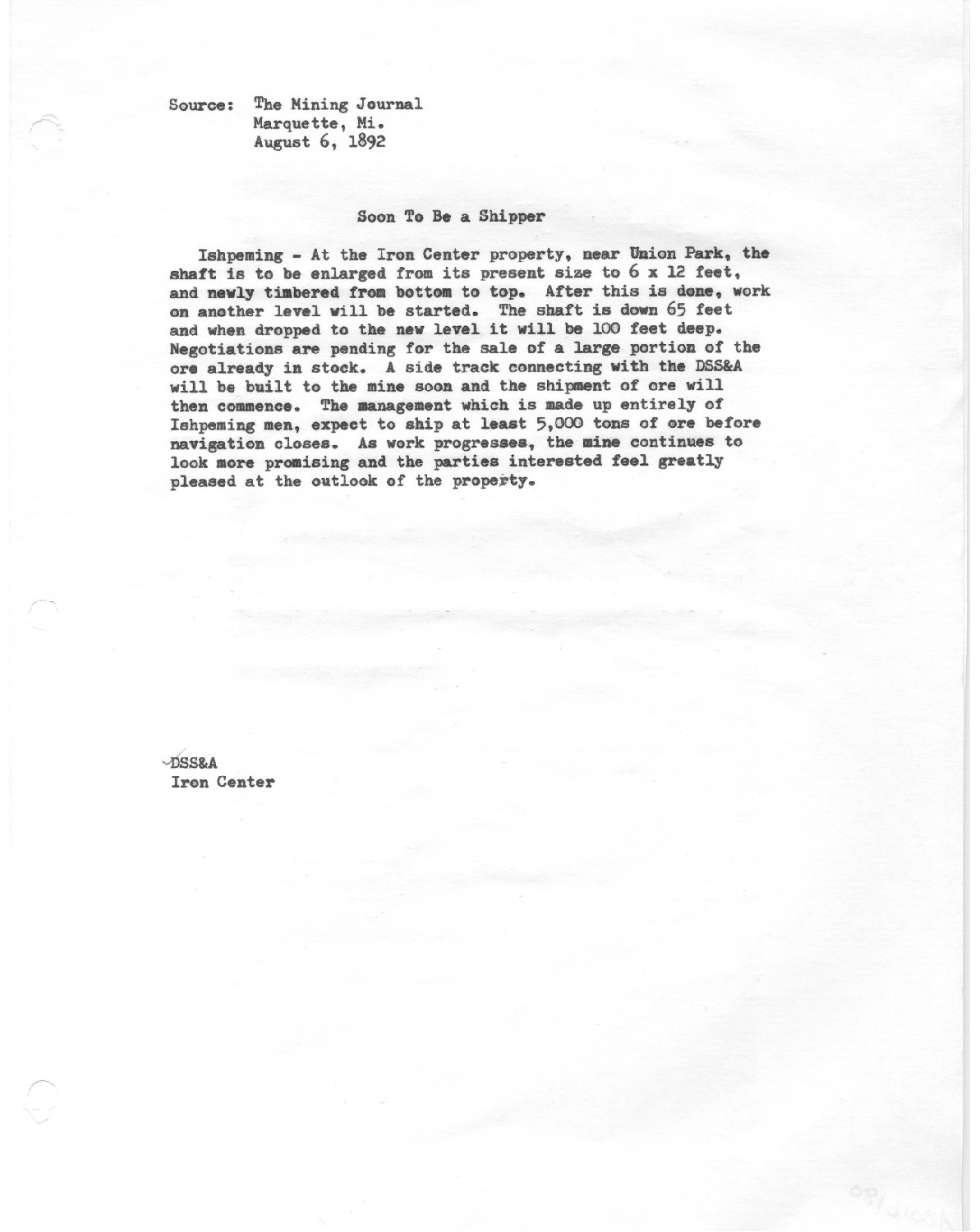 At the Iron Center property near Union Park, the shaft is to be enlarged from its present size to 6x12 feet, and newly timbered from bottom to top.
