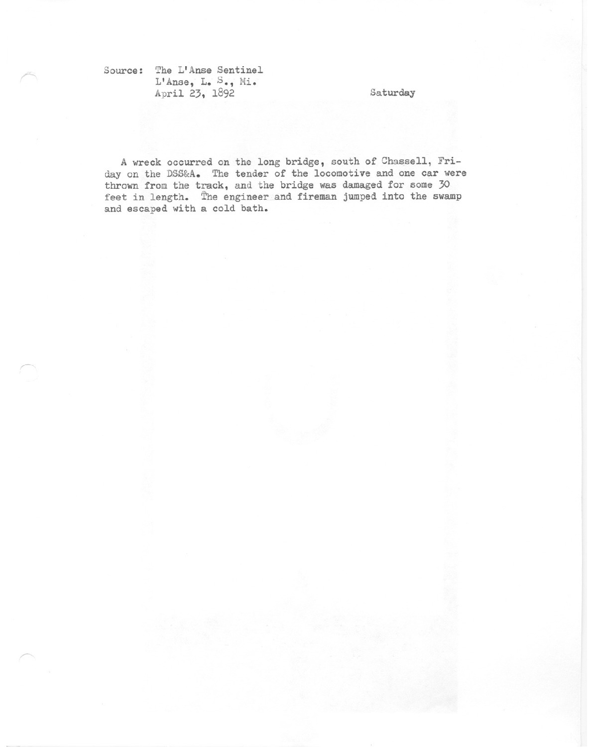 Wreck occurred on the long bridge, South of Chassell, Friday on the DSS&A. The tender of the locomotive and one car were thrown from the track, and the bridge was damaged for some 30 feet in length. The engineer and fireman jumped into the swamp and escaped with a cold bath.