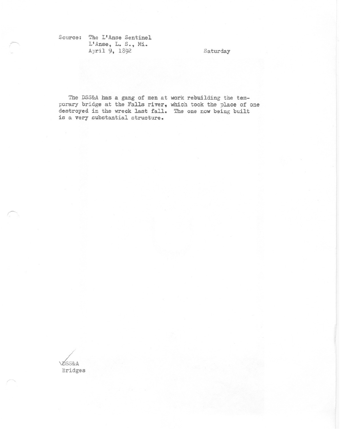 The DSS&A has a gang of men at work rebuilding the teamporary bridge at the Falls river, which took the place of one destryoed in the wreck last fall. The one now being built is a very substantial structure.