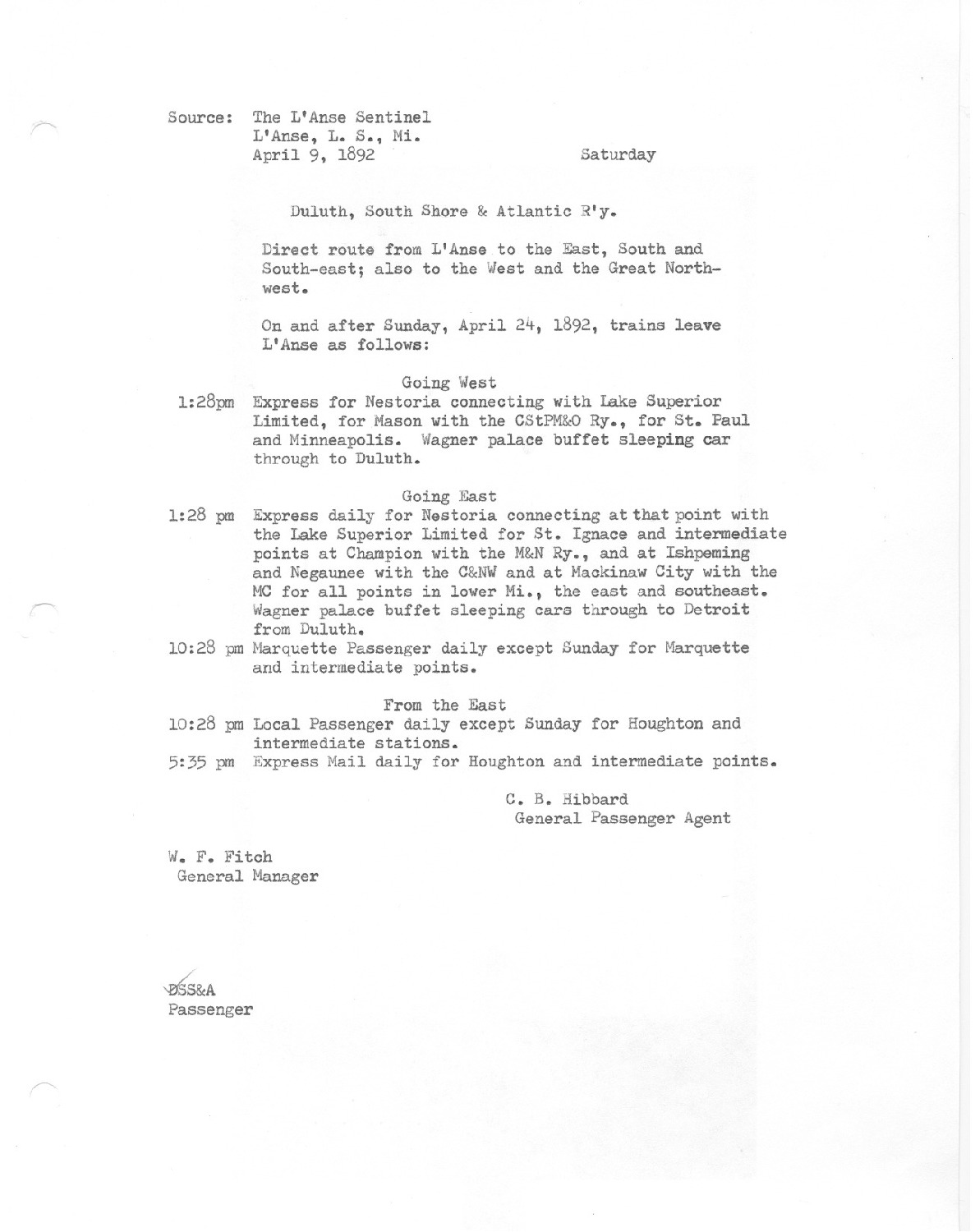 Direct route from L'Anse to the east, south and south-east also to the West and the Great Northwest.
