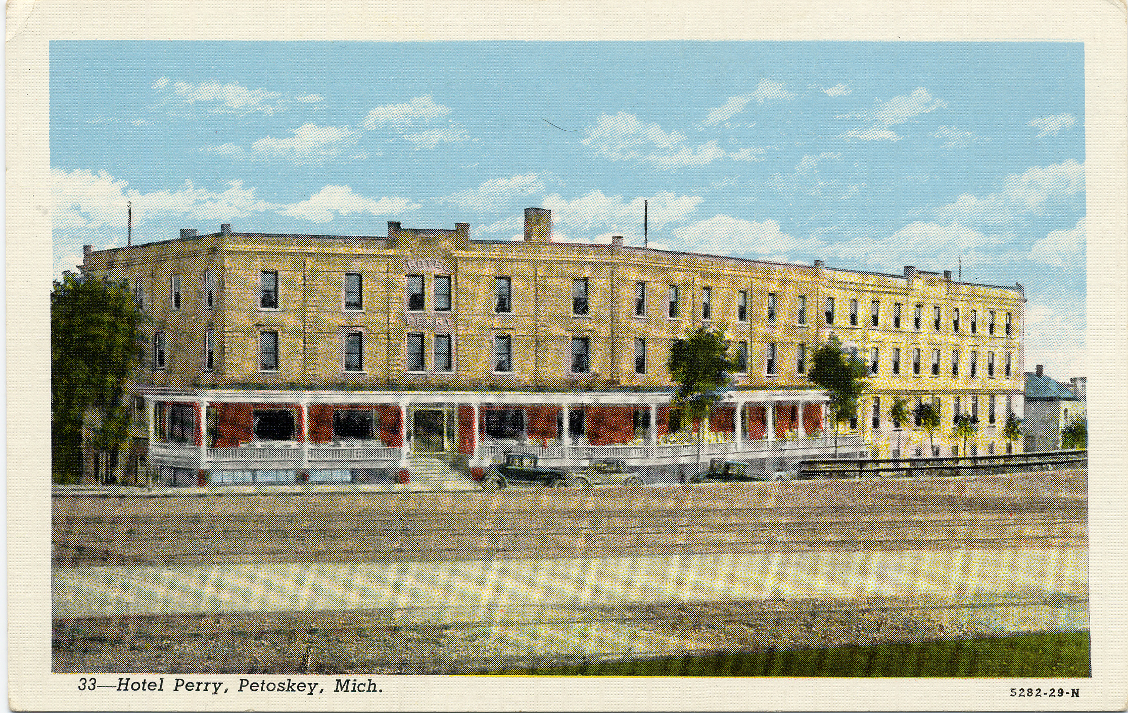 Handcolored postcard of the Hotel Perry, Petoskey, Michigan, viewed from the southeast across the railroad tracks, ca. 1920.