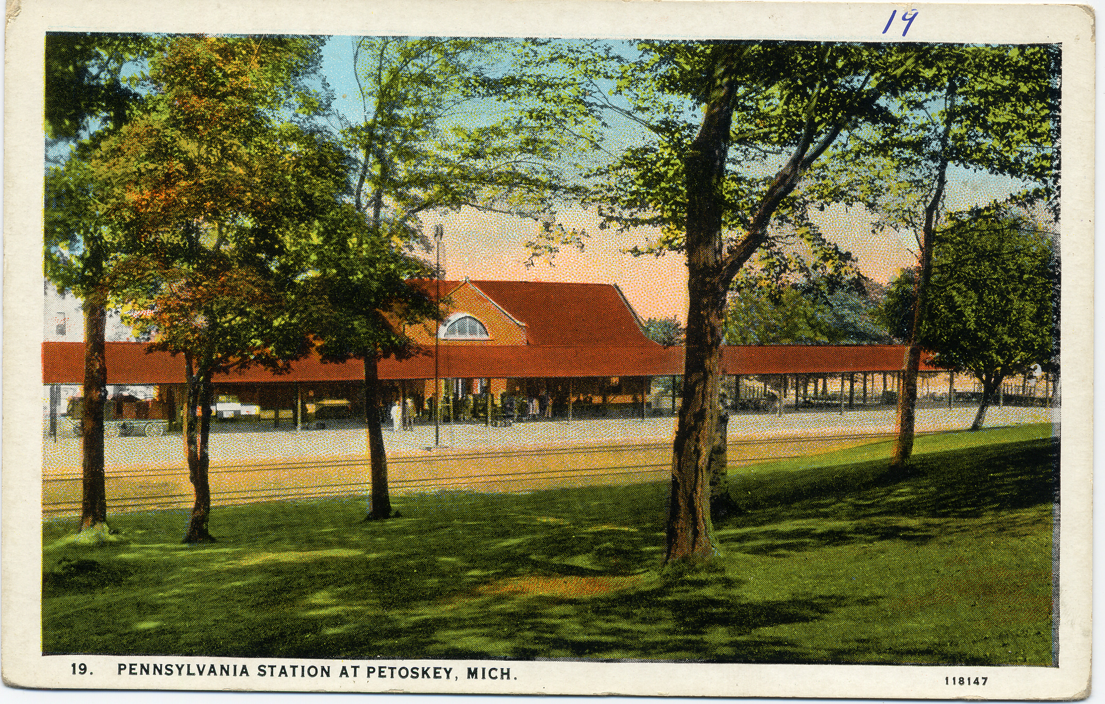 Handcolored postcard of Pennsylvania Station, Petoskey, Michigan, from the park, ca. 1920.