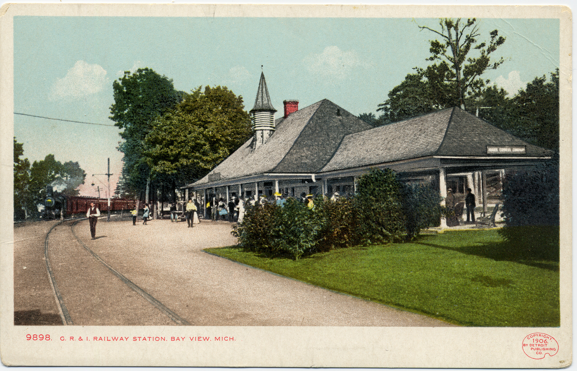 Handcolored postcard of the Grand Rapids and Indiana Railway Station, Bay View, Michigan, showing the north side, with a train approaching and people standing about, ca. 1906.