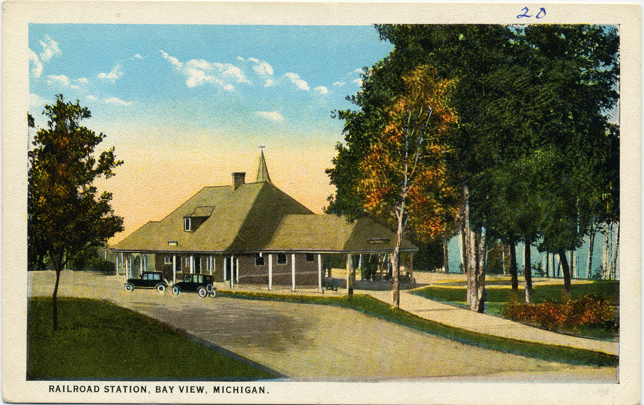 Handcolored postcard of the south side of the Grand Rapids and Indiana Railway Station, Bay View, Michigan, ca. 1920.