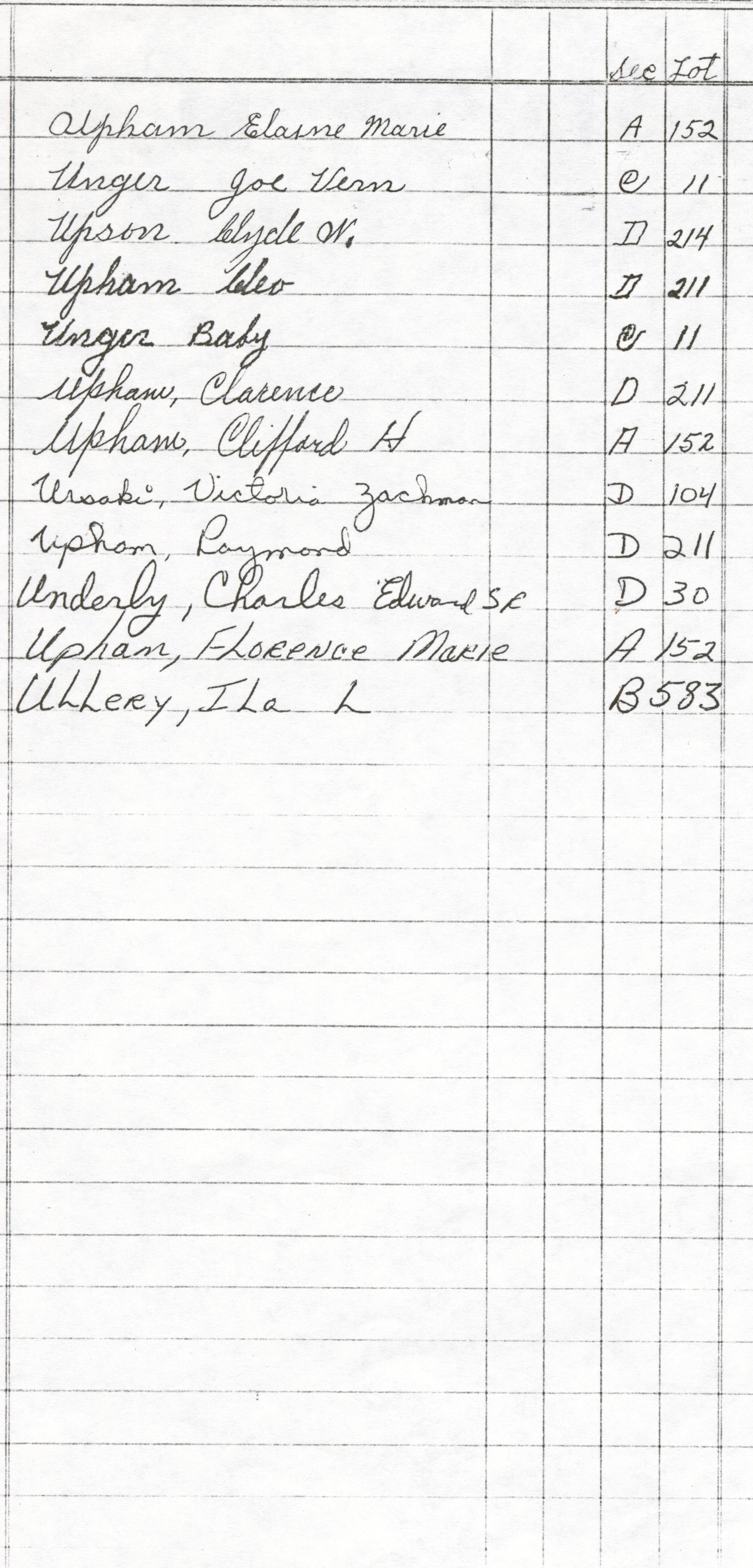 Part 1: Elaine Upham, Joe Unger, Clyde Upson, Cleo Upham, Baby Unger, Clarence Upshaw, Clifford Upham, Victoria Ursaki, Raymond Upham, Charles Underly, Florence Upham, Ila Ullery.