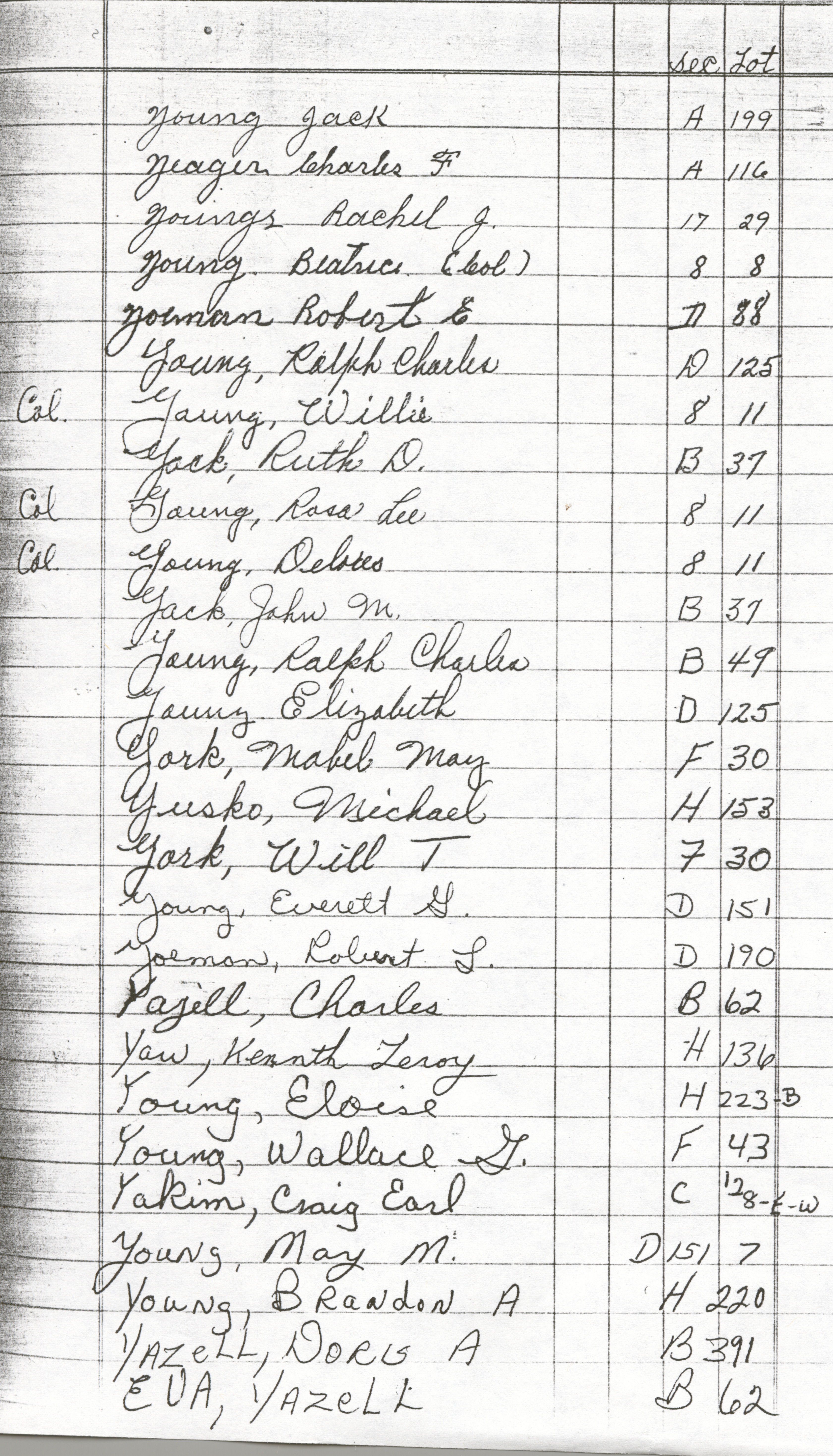 Part 1: Jack Young, Charles Yeager, Rachel Youngs, Beatrice Young, Robert Yoeman, Ralph Young, Willie Young, Ruth Yack, Rosa Young, Delores Young, John Yack, Ralph Young, Elizabeth Young, Mabel York, Michael Yusko, Will York, Everett Young, Robert Yoeman, Charles Yajell, Kenneth Yaw, Eloise Young, Wallace Young, Craig Yakim, May Young, Brandon Young, Doris Yazell, Eva Yazell.