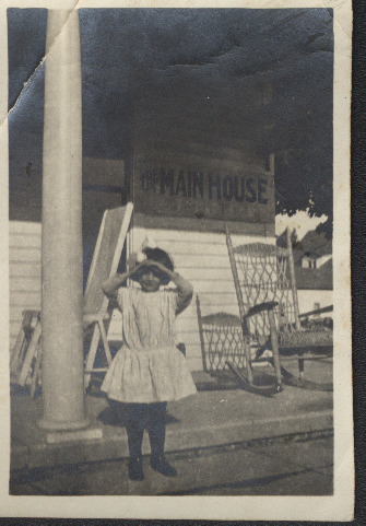 Color photo of Ibella Main as a child in front of Main House, Alden, Michigan ca.1910.