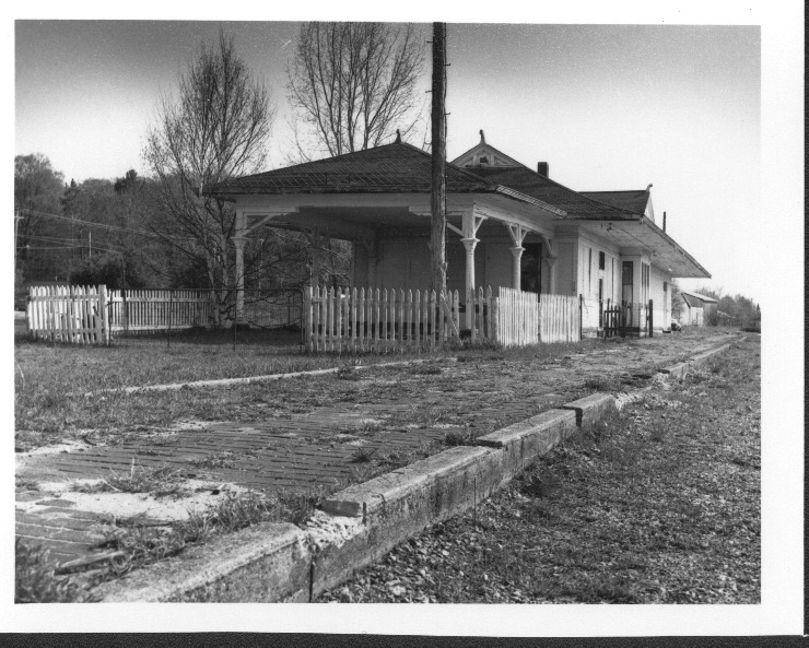 Black and white photo of depot building in disrepair, north elevation, Alden, Michigan ca.1980.