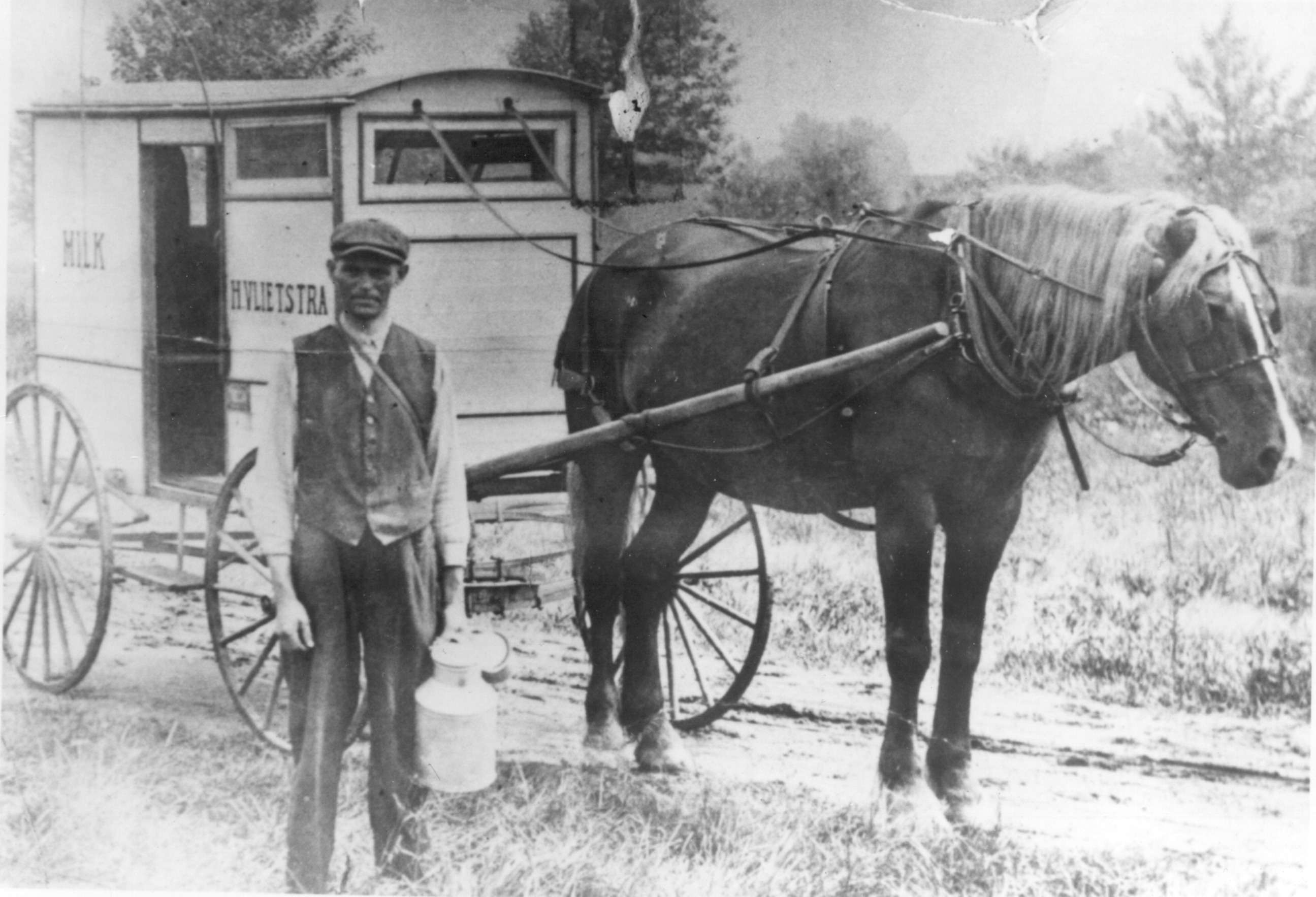 Henry Vlietstra with Milk wagon, on Church Street, north side of Kalamazoo