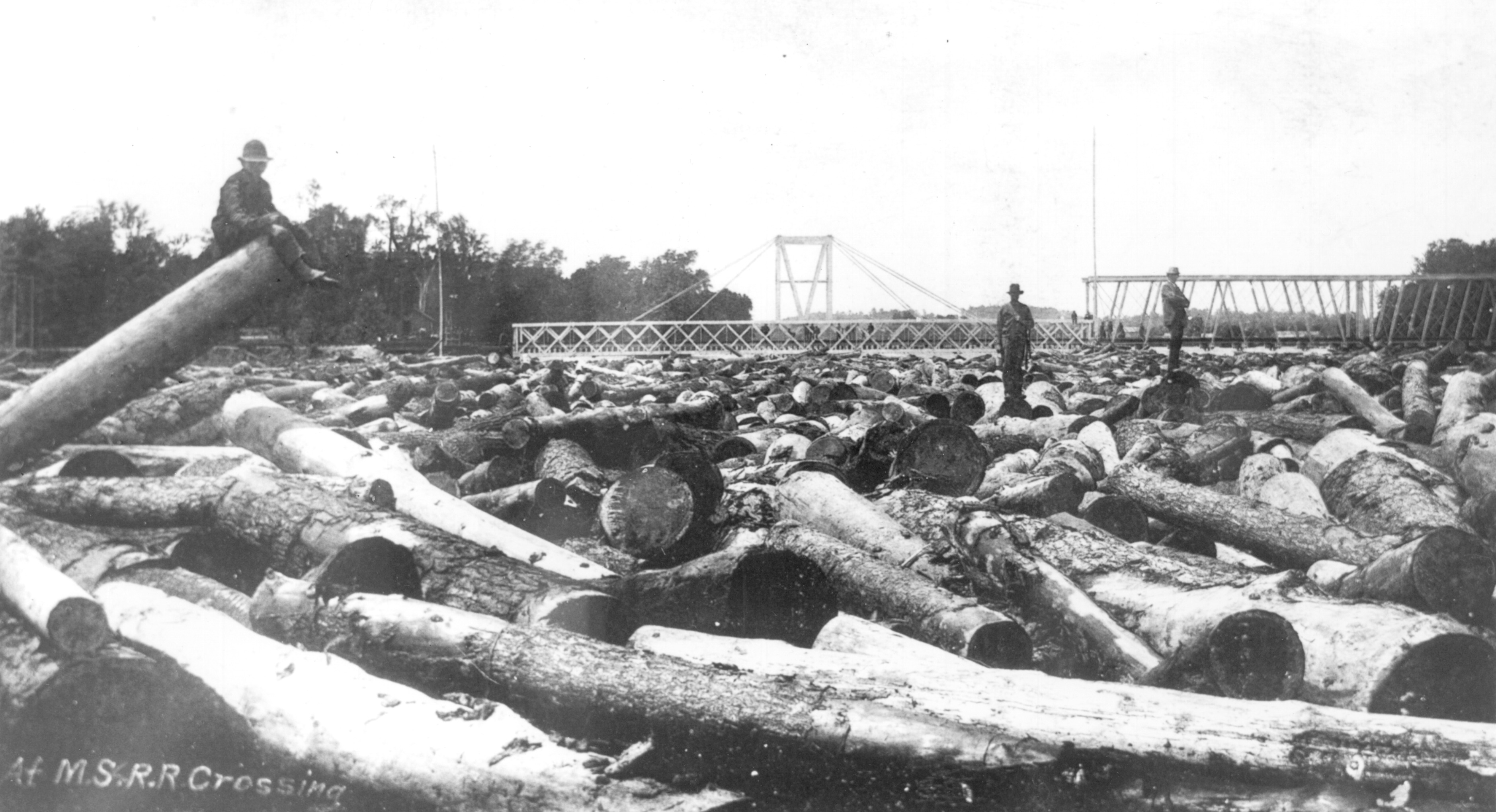 Log jam on Grand River, Michigan Southern Railroad bridge