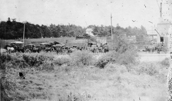 Photograph of lumber yard, horses and carriages next to the A. Wise, Sash, Door and Blind Factory on East Michigan Avenue in Lansing, Michigan.