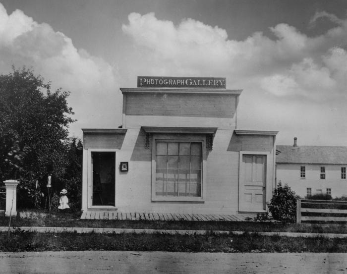 Photograph of Abraham Cottrell's Photograph Gallery at 607 East Michigan Avenue in Lansing, Michigan. Located just east of Larch Street. Captain Cottrell, an Englishman, was a Civil War veteran, but he acquired his title while a member of Lansing's fire department.