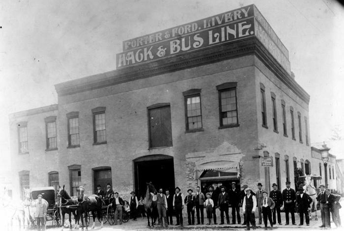 Photograph of Porter and Ford livery in Lansing, Michigan. Located at 300 South Capitol Avenue. Built as a foundry after the Civil War by Stannard and Luther Baker. In 1880, William Porter opened a livery stable that operated until 1908 when the building burned. James Porter built a new building that served as a service station and garage until 1965 when the building was replaced by the Commerce Center Building. It, in turn, became the Cooley Law School Building.