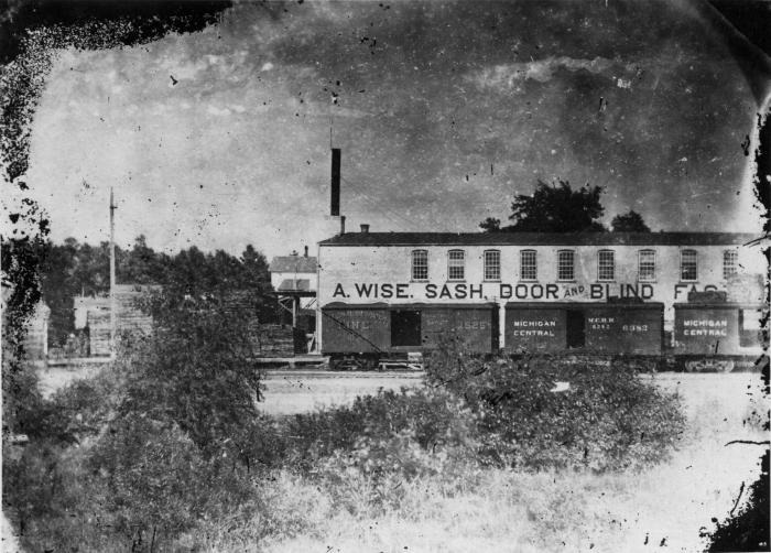Photograph of A. Wise, Sash, Door and Blind Factory on East Michigan Avenue in Lansing, Michigan. Michigan Central RR cars and the loading dock are in view.