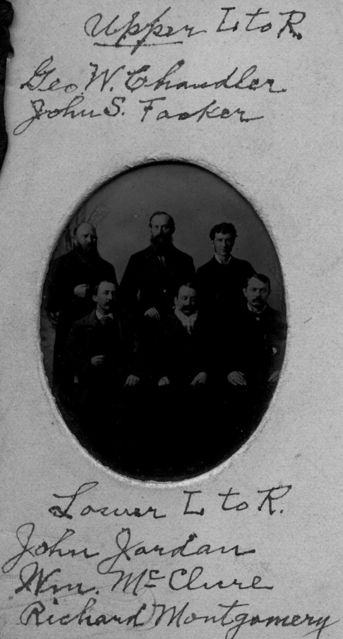 Card from New Year's party 1880. Attendants include: Back row, Geo W. Chandler, John S. Facker. Front row, John Jordan, Wm. McClure, Richard Montgomery.