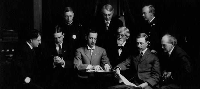 Photo of the Lansing Board of Police and Fire Commissioners. Sitting-L.E. Imes, Clerk-P.F. Gray, John Bohnet, J.E. Warner, J.P. Edmonds, H.C. Hedges. Standing-Chief Henry Behrendt, President E.L. Smith, Chief Hugo Delfs.