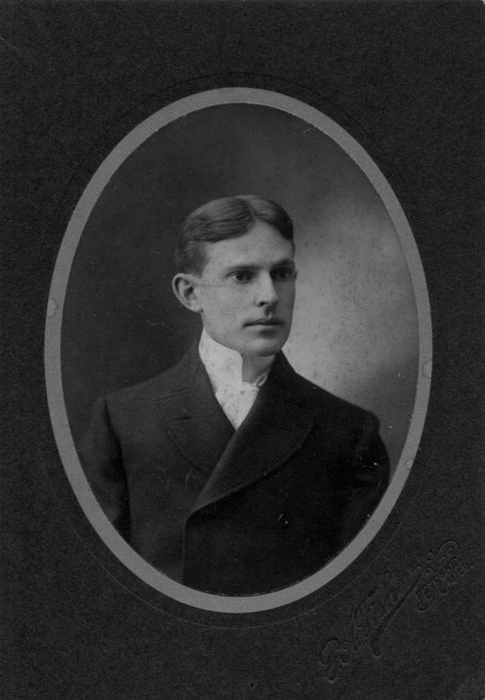 Photo of Willard Freeman Hopkins, Lansing, Michigan. Graduate of Michigan State College. Employed in Ben Davis' bank. A vice president of the Chicago Trust Co. Sister is Bessie Hopkins. They came from Kalamazoo, Michigan. Attended Boat Club parties on No. Washington Ave. A young father in 1900. Died in Chicago, IL.