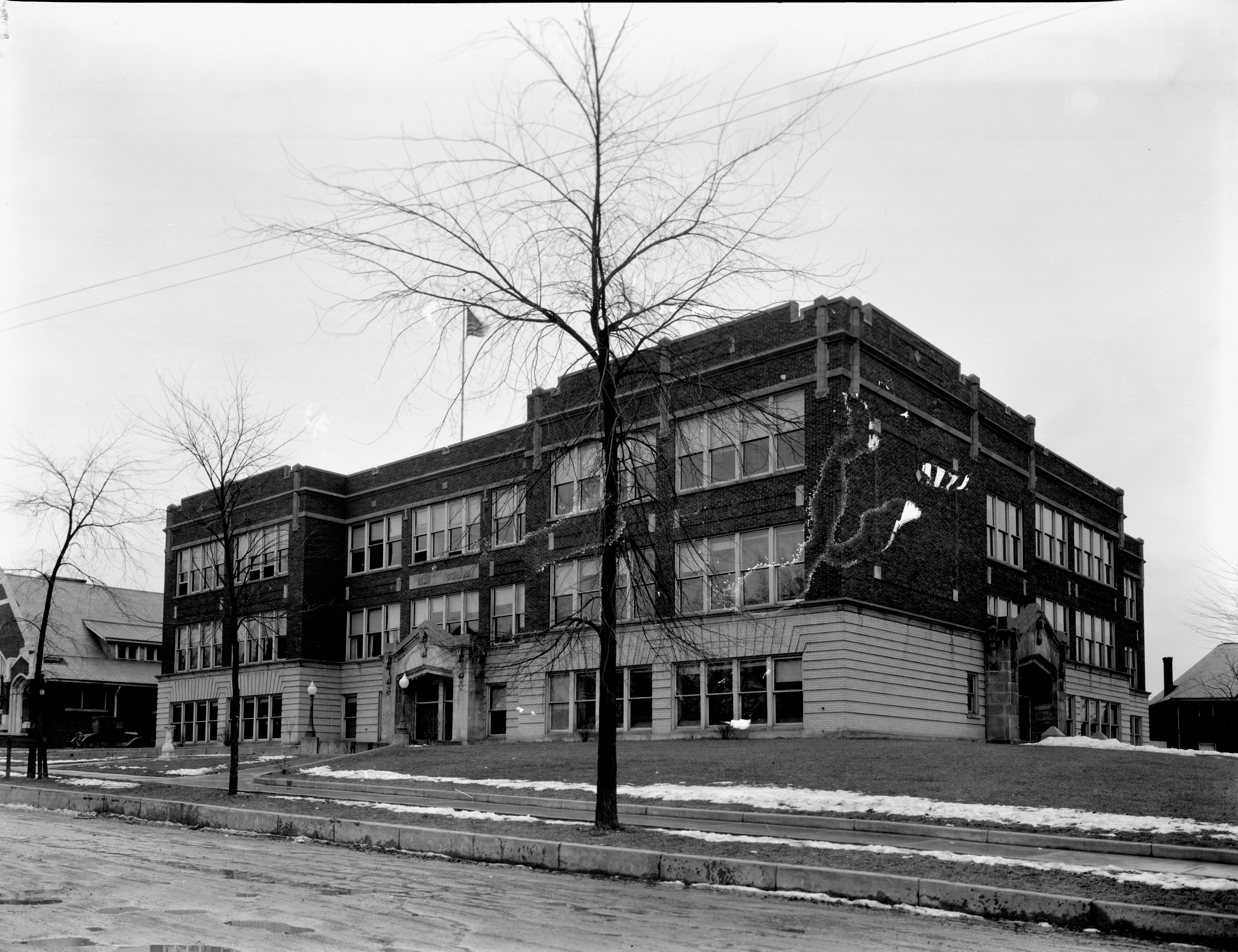 Print made from negative of Plymouth High School. The school was built in 1923 on the site of the original high school destroyed by fire in 1916. This building now houses Central Middle School.