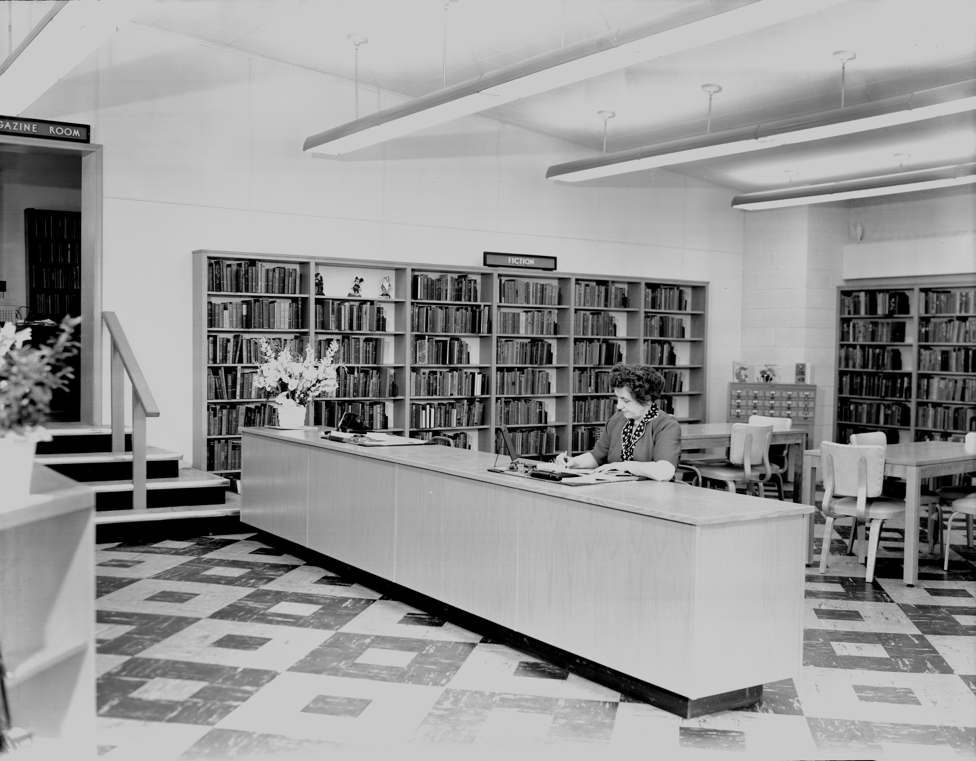 Print made from negative of a librarian in the fiction area of the new library addition. This section was added to a frame house on Main Street, downtown Plymouth.