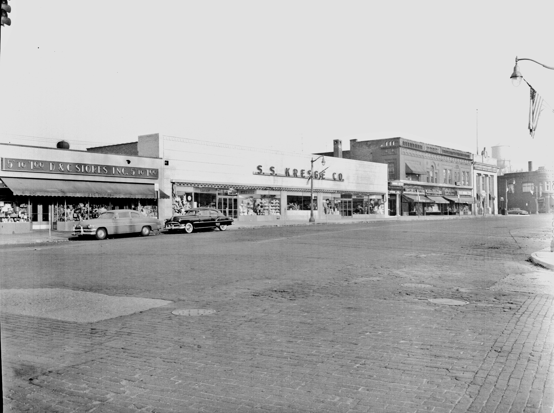 Print made from negative of the Kresge Building in downtown Plymouth prior to the paving of Main Street in 1955.
