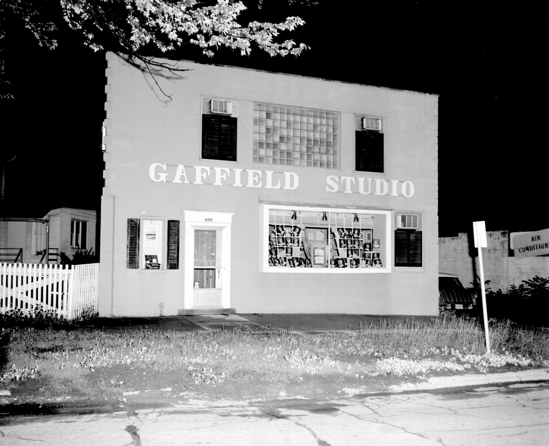 Print made from negative of the original Gaffield Photography Studio taken at night on July 4, 1958. It was located at 600 W. Ann Arbor Trail Plymouth, Michigan..