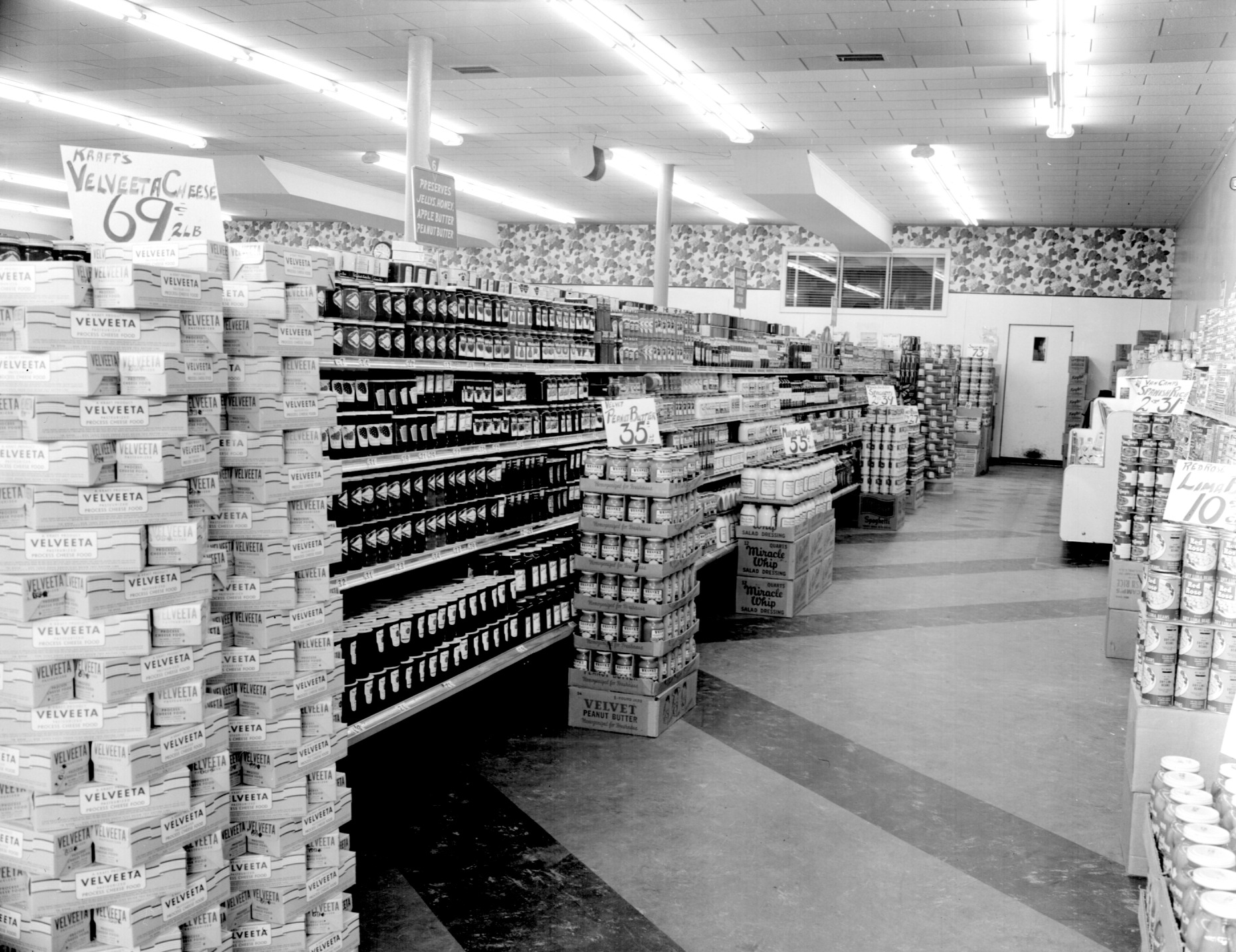 Print made from negative of the interior of Stop & Shop Supermarket, March 1950. This store was located at 470 Forest Avenue, Plymouth, Michigan. Bill and Jay Rucker were co-owners.