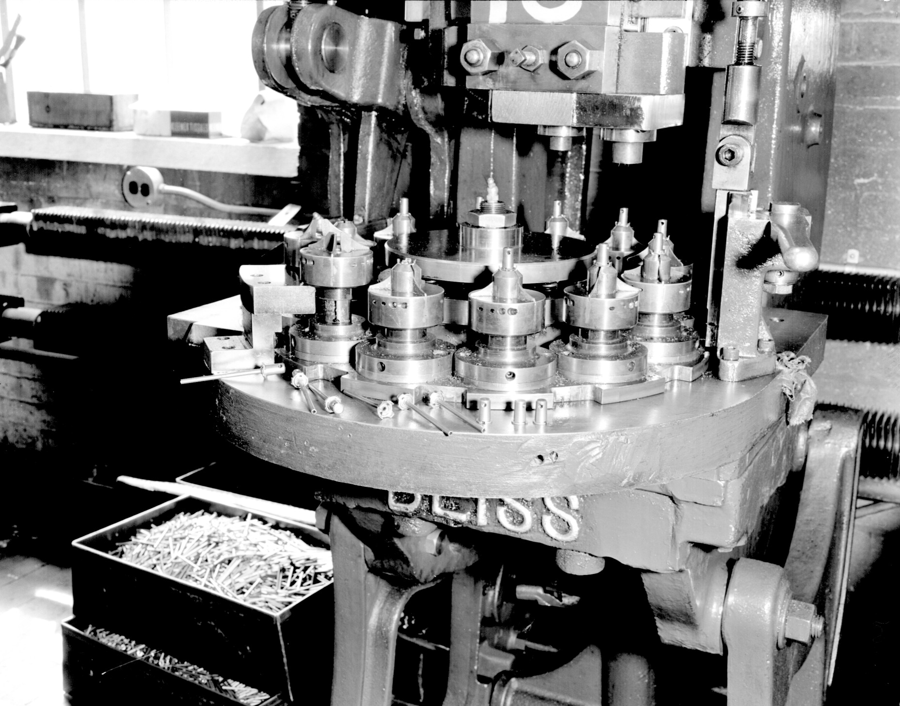 Photograph of stamping machinery for the Daisy air rifle at the Daisy Manufacturing Company, c.1950.