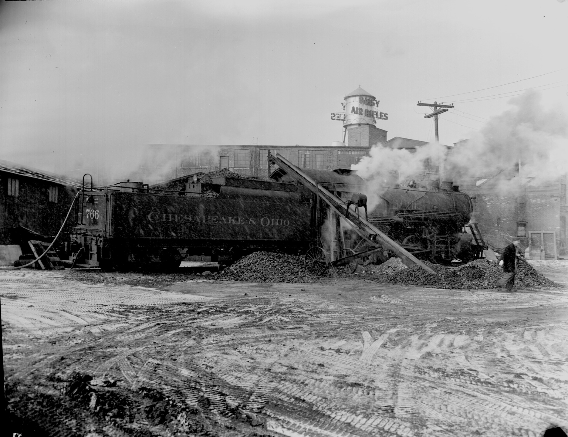 Photograph of a Chesapeake & Ohio train unloading coal used to power the Daisy Manufacturing Company, c. 1950.