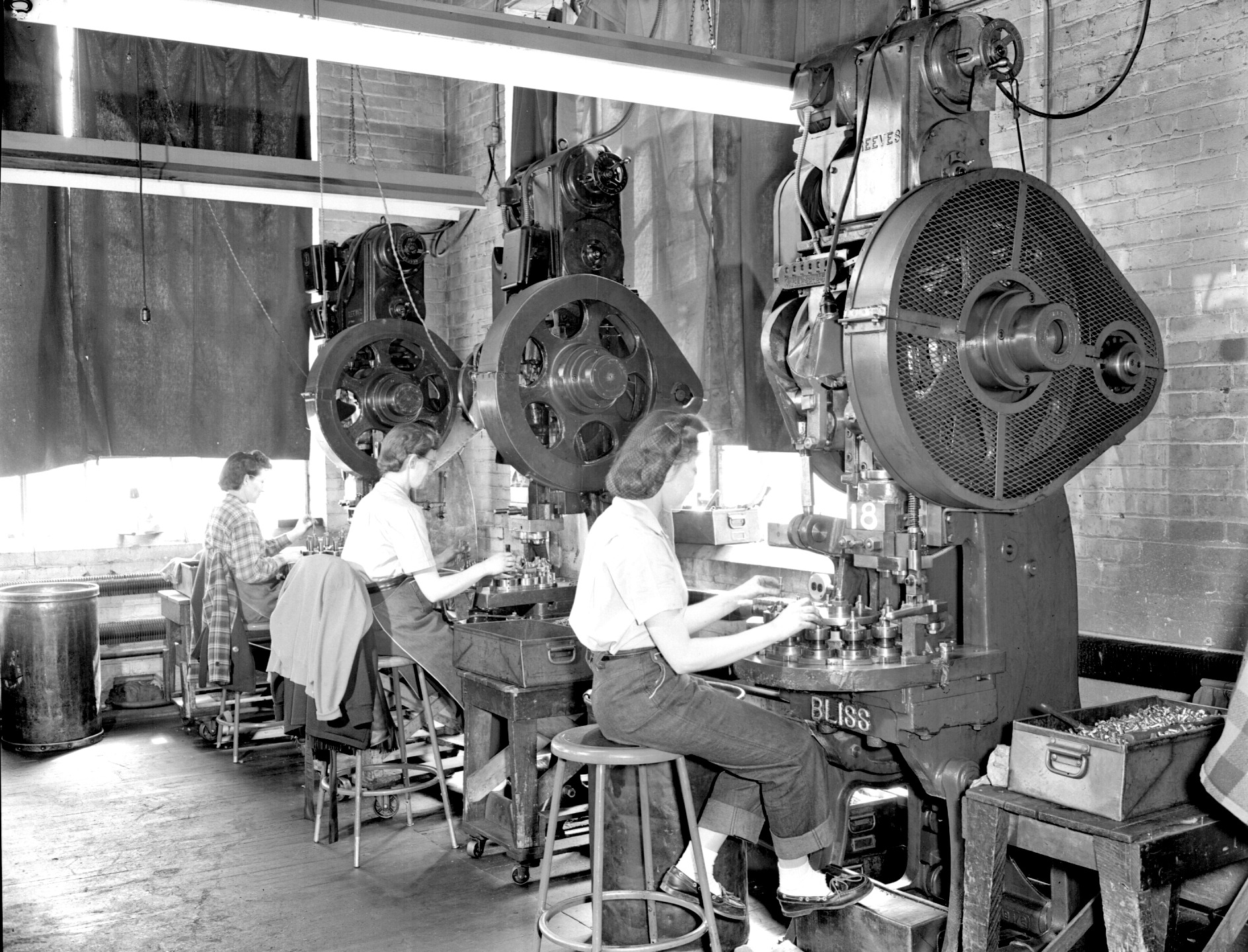 Photograph of female employees sitting at the stamping machines in the Daisy Manufacturing Company, c.1950.