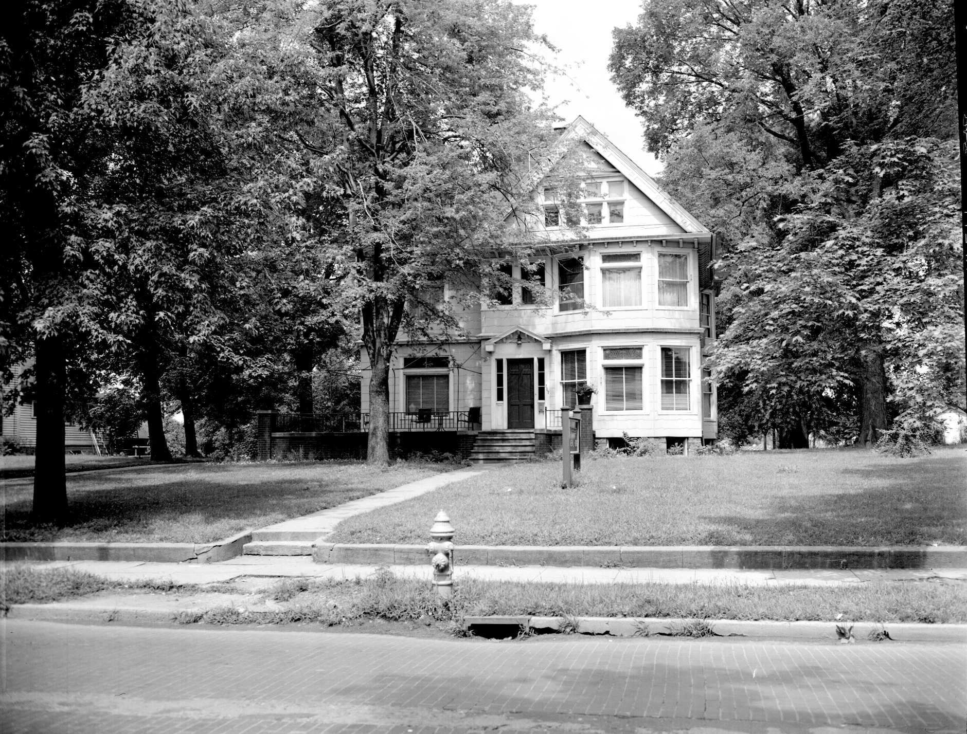 Print made from negative of Sonderegger Funeral Home at 217 N. Main Street. The home was owned by Karl J. Sonderegger. It is still standing, but has a business facade on the front.