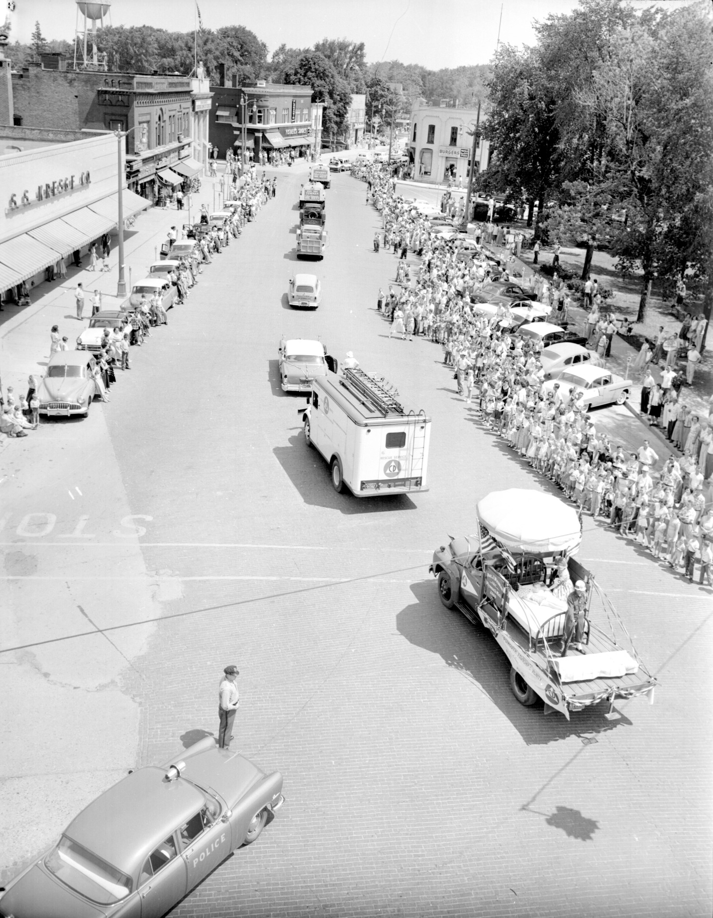 Aerial view of the 4th of July Parade marching north on Main Street, 1955. Kellogg park is on the right.