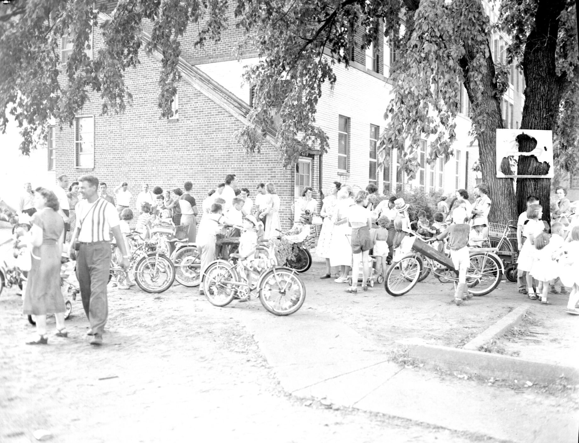 Photograph of children gathering on their bicycles for annual 4th of July parade, 1951.