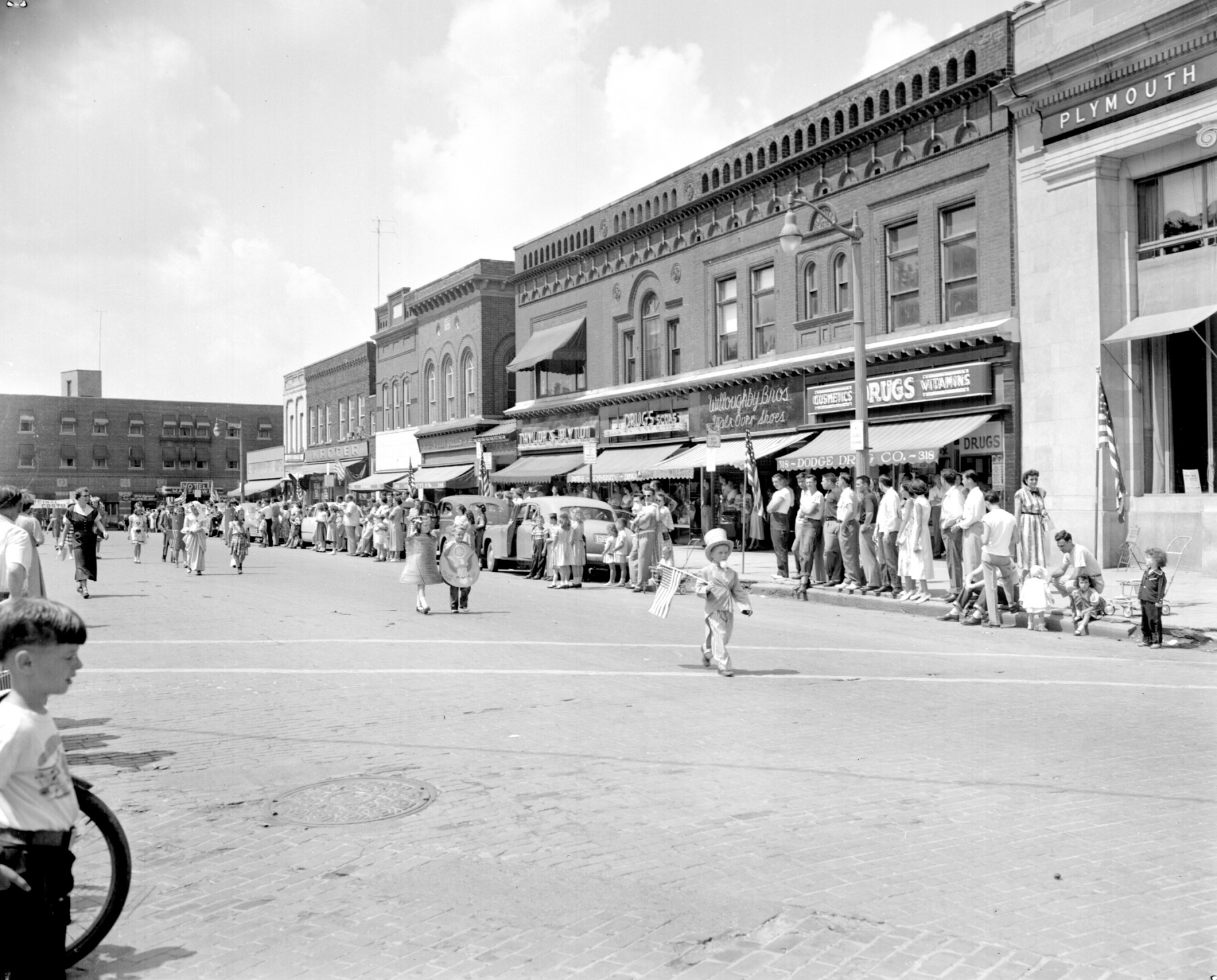 Marchers on Main Street during the annual 4th of July parade, 1950. The Kroger Grocery Store is still in business and the bricks are visible on the street.